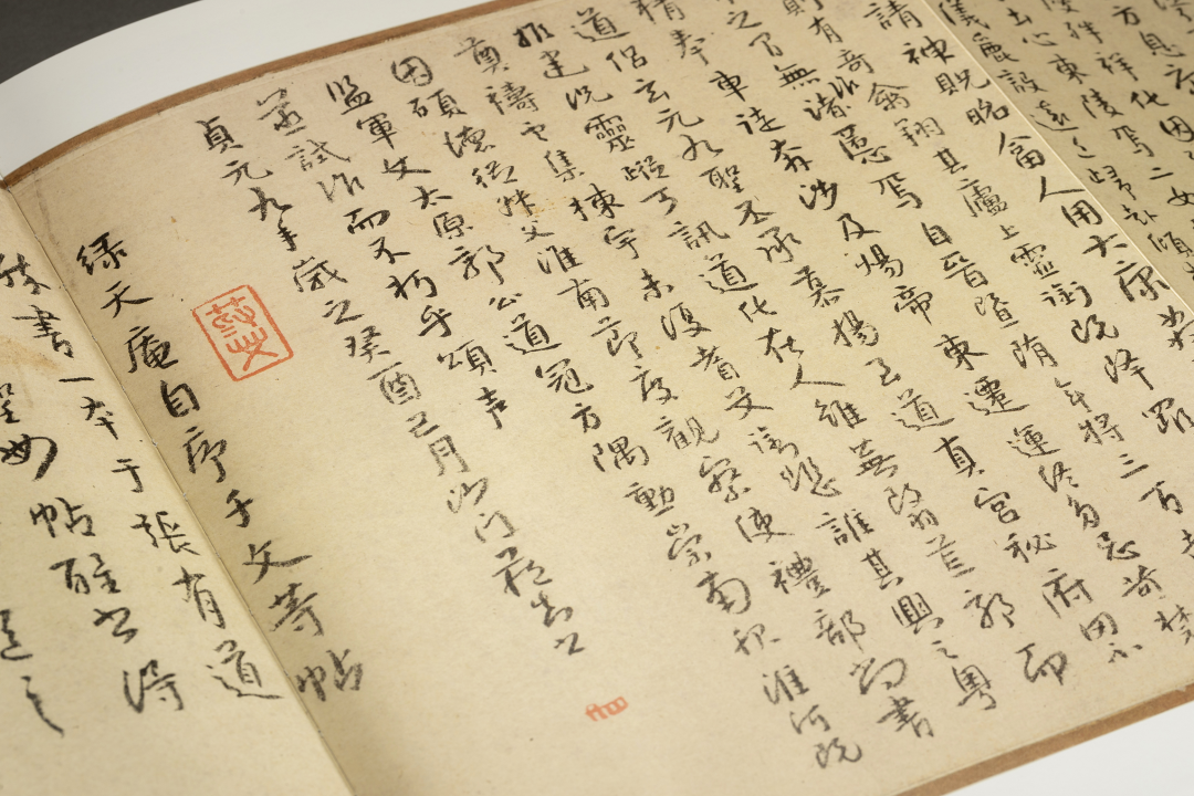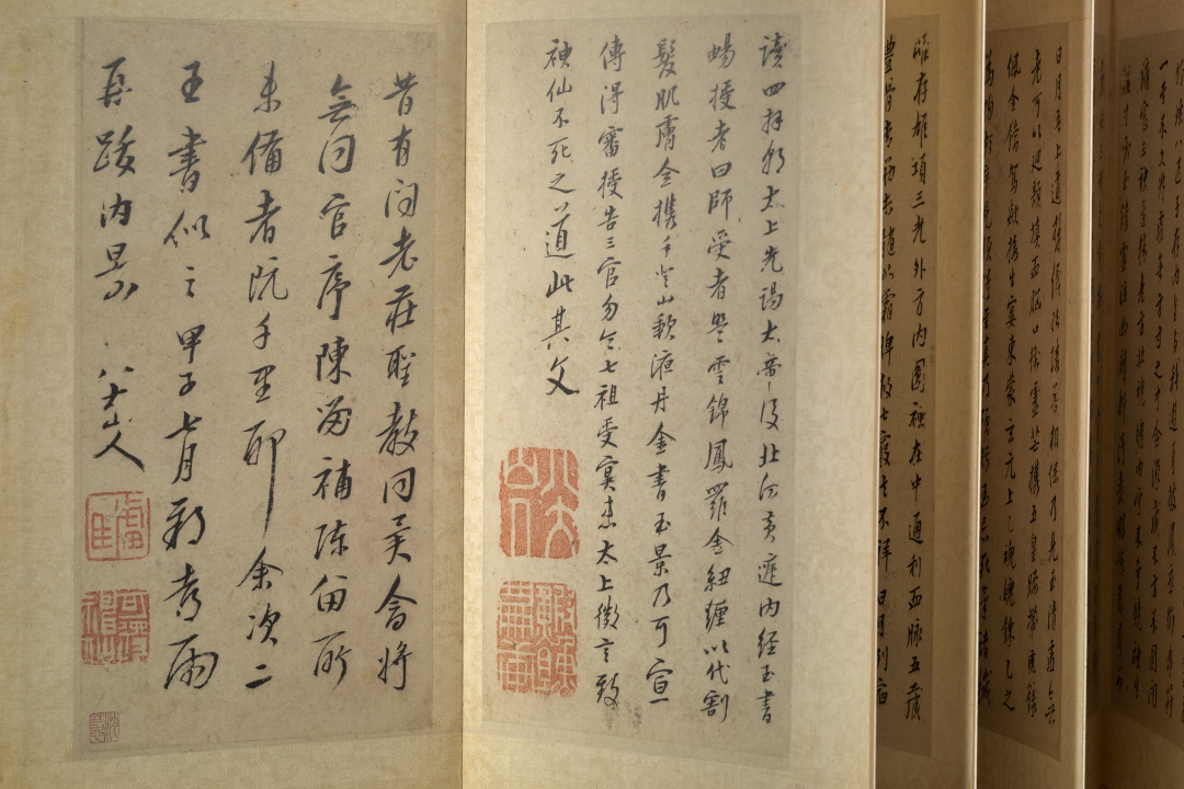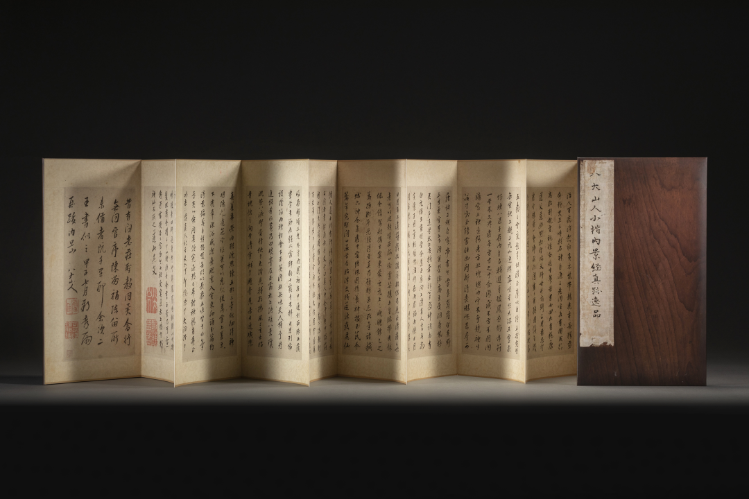 第二开则略具元代倪云林风貌, 属于“一江两岸”式“平远”构图法,画面空灵,虚实相生,所谓“画之妙在无笔墨处”,其留白处给人以无限的遐想。这组册页虽然在构图上有明显的传承,但在笔墨语言上则完全是自家面貌,淡墨干笔,以篆笔秃毫简致地皴擦出山体、树木与房舍,再以浓墨破之的画法,极具个人特色。这种名为拟古实则自运的创作方式与董其昌如出一辙。八大山人写于1684年的《黄庭内景经》 ,字形斜画紧结,用笔方式明显带有唐楷的提按写法。八大山人在书法上的变化发展几乎与其花鸟画的三个阶段同步,这点在创作于1692年的《涉事册》中得到很好的体现。