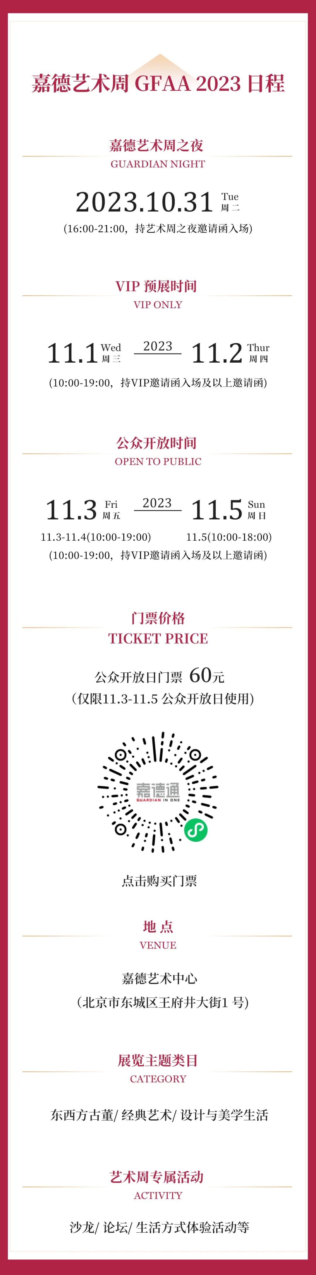 2023年,嘉德艺术周(GFAA)新老展商将汇聚一堂,东西方古董与经典艺术融合,传统与当代交相辉映,荟萃出神奇的时光隧道,藏家和艺术爱好者可徜徉其中,尽飨古今中外人文艺术盛筵。