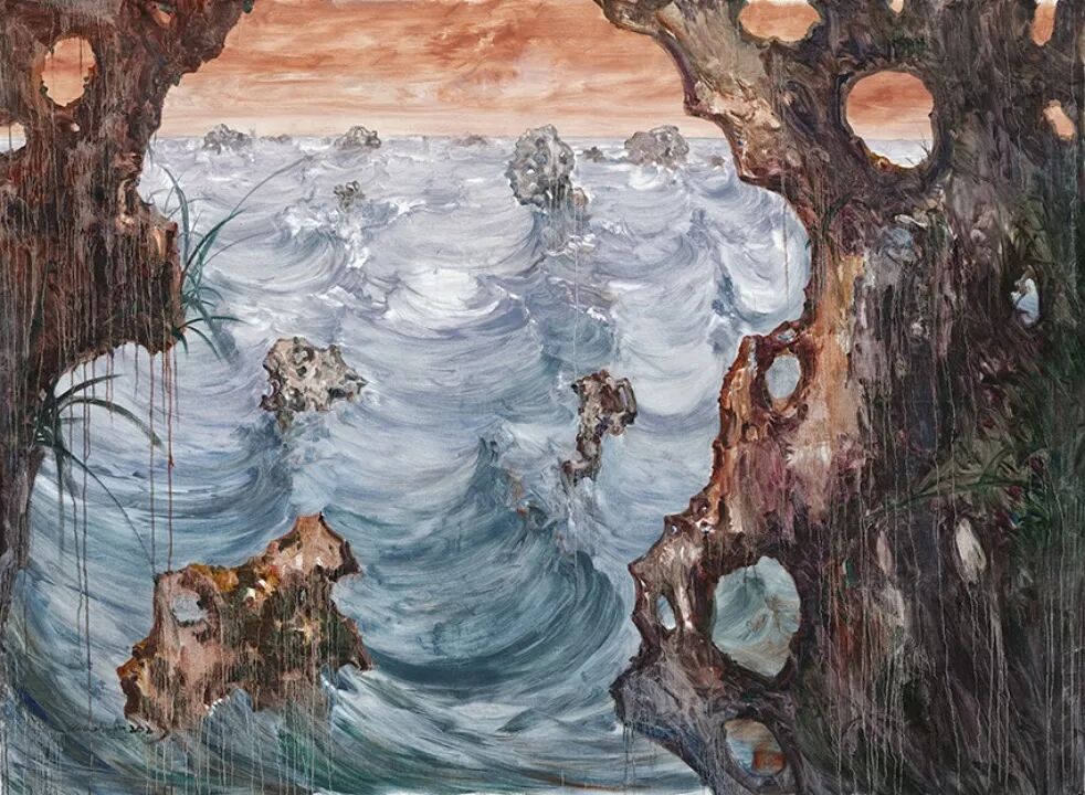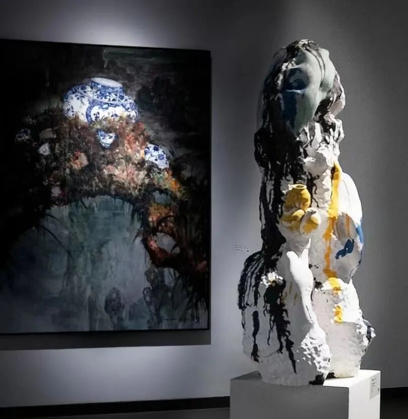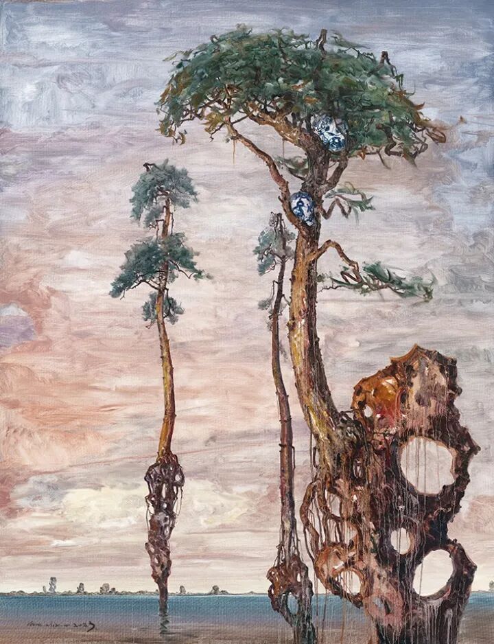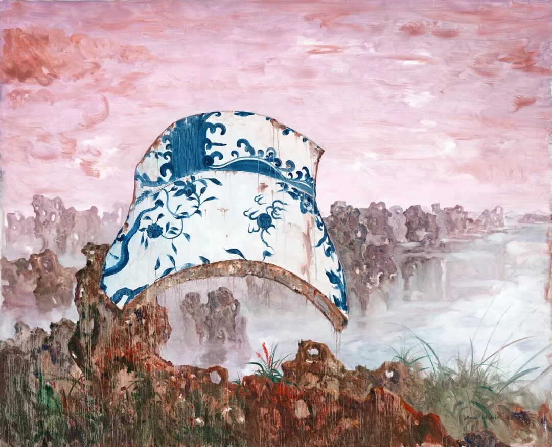 作品中画入了松树、瓷器、太湖石等中国元素,瓷器是中国传统的艺术形式之一,具有悠久的历史和独特的艺术价值。在当代艺术中,艺术家以瓷器为材料或形象进行创作,将传统的瓷器文化与现代艺术手法结合,使瓷器成为当代艺术的新表达方式。