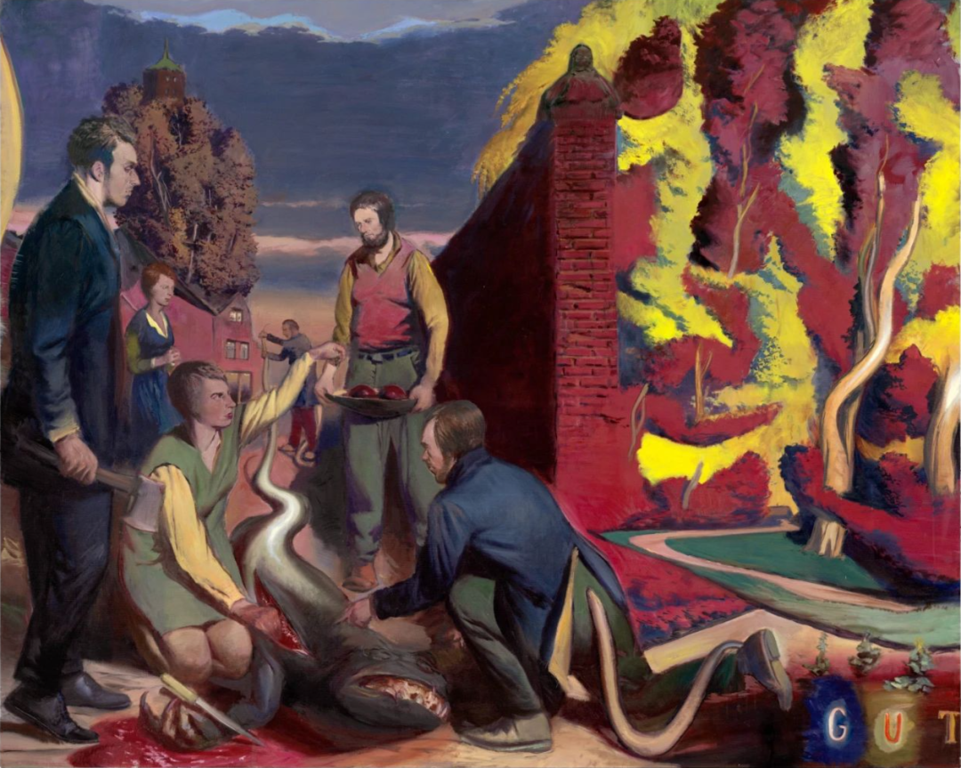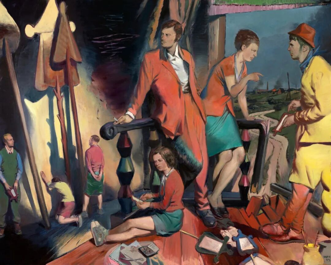 不过在劳赫的构图里,叙事更为模棱两可:在一幕室内的场景中,各种比例不同、着装各异的人物产生了令人费解的组合。画面右侧,似乎有一个女人和身穿黄色衣服的男人在争吵,而他们身后的那片乡村风景中正有一团微小的火苗在燃烧。