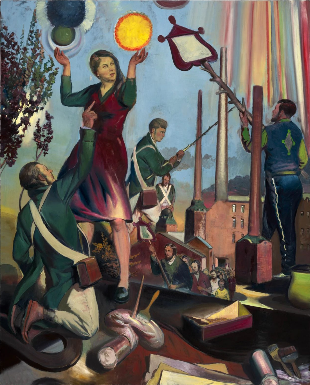 作品《太阳》(Sonne,2023)也出现了相同的铁质标牌,一个大胡子的人物挥舞着地标站在阳光之下以及一片高耸的指示塔中;而在《漂移》(Trift,2023)中——这个德语单词也有“牧场”之意——同样地,数块标牌被用作各种不同的工具。这些“复古未来主义”的物件成为了艺术家此系列绘画中的母题,也是一个绝佳的示例,体现了形态、人物、甚至某些风格性的装饰是如何作为个人的图像学而存在的,而劳赫经常将它汲取、重新融入自己的作品。