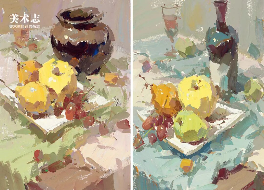 考题解析:考题是色彩静物,可以从同学的描述中得知主体物是一个深色罐子,再加绿色玻璃酒瓶和一本白色的书,其余的就是水果的组合,难度不高,都是比较常规的静物,这类基础考题,主要还是考察同学们对构图、色调、造型、塑造程度的把握能力,想要拿到高分就必须把基础的部分做好。