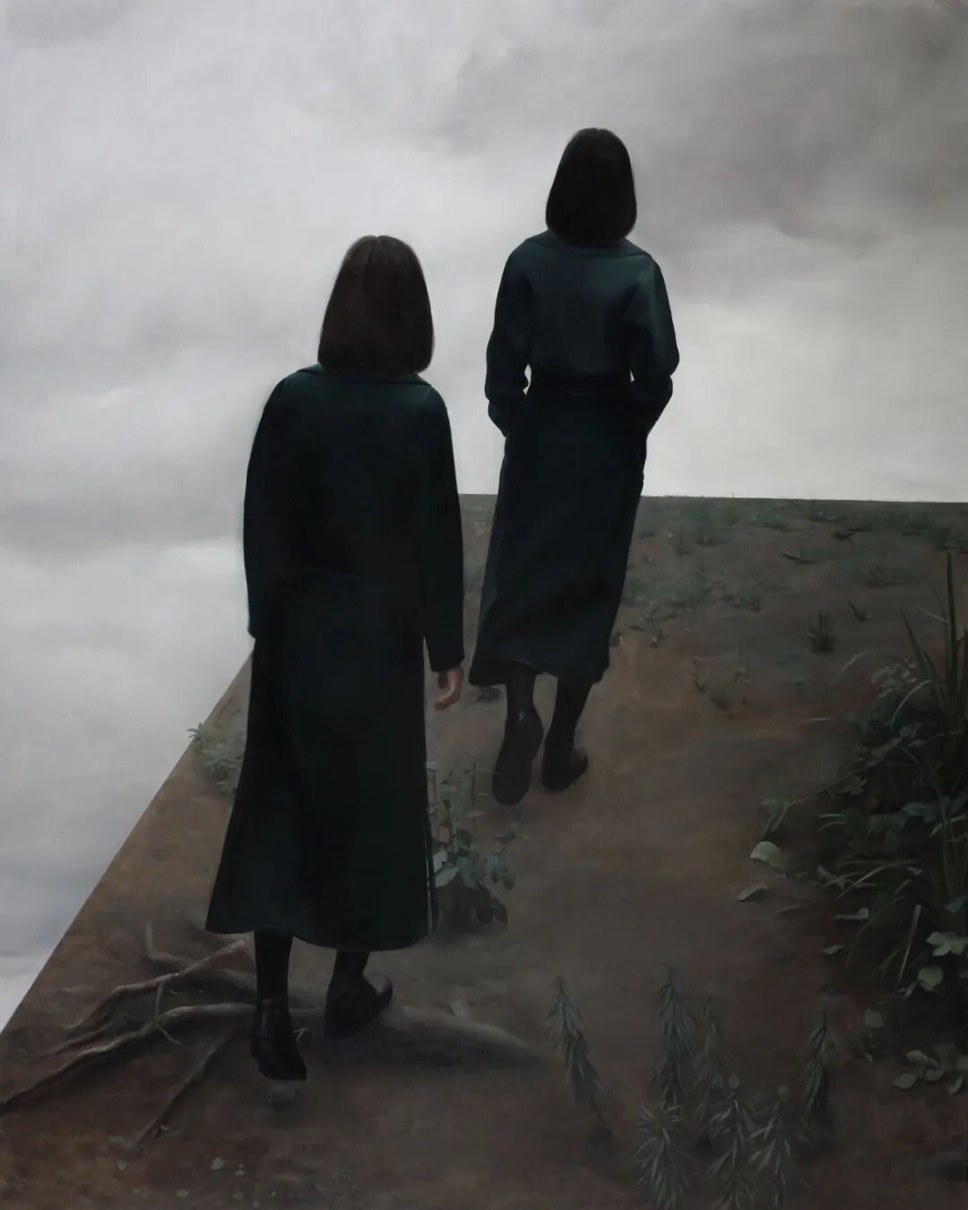 本期艺术家对话邀请两位创作媒介和创作议题完全不同的艺术家。他们分别在作品中创造了多位“背向观众的人”,风景对面的“背影人物”(rear-view figure)成为他们的“内在之人”。艺术家薛若哲绘画中的人物常常有意背向观众,他们沉浸在个人的思绪中。这些难以辨析的画中人被故意抹去了特殊性,成为普遍意义上的人类。人——大多数时候都是孤身一人望向风景,因此这个人也可以是每一个人,可以代表观众出现在画面中。郑源近作《最小限度的(一段路)》分别跟随了9个人在夜幕将至之时行走,影像中的他们在记忆或意义的牵引下前进,每一部影片中的个人借助风景的构建,勾勒出属于他们的“个人史”。风景不是远眺或俯瞰的对象,而是主体通过感知,身体性地与世界共存。这些作品里的人具备多重意义和身份,他们既是艺术家们描写的对象,又是具有主体的图像;既是作者自反的镜像,又是观看者可透视、可内观的自我。让我们像“内在之人”一样注视着作品中的人,和他们一起观察风景。这种观看的行为或许包含一个深不可测的维度:我们正在被自己观察,不是凝视的主体,而是作为被凝视的客体,观察者和被观察者同时存在,从背后观看我们自己。