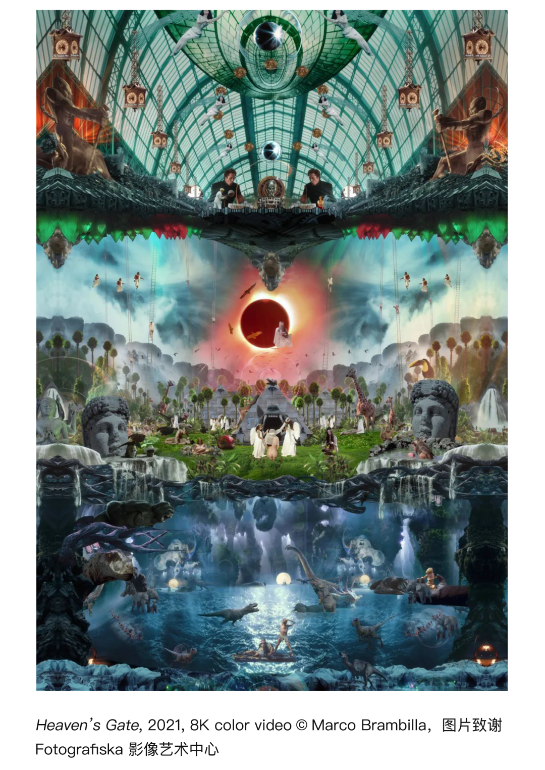 《双重呈现》的取名,作为一种怀旧实践回应了电影行业一个已消失的现象:不同于现在的单片放映,而是连续放映两部影片的传统。本次展览将展示艺术家的两件代表性作品,布拉姆贝拉《Megaplex》系列的两件作品《天堂之门》(2022) 和《王者尺度》(2023), 展现了其视觉叙事和数字艺术呈现的功底。以重新诠释流行图像和开创性使用数字成像技术而闻名、视频艺术家马可·布拉姆贝拉的《Megaplex》系列视频拼贴作品,将带领观众踏上一段引人思考的旅程,探索流行文化的边界。