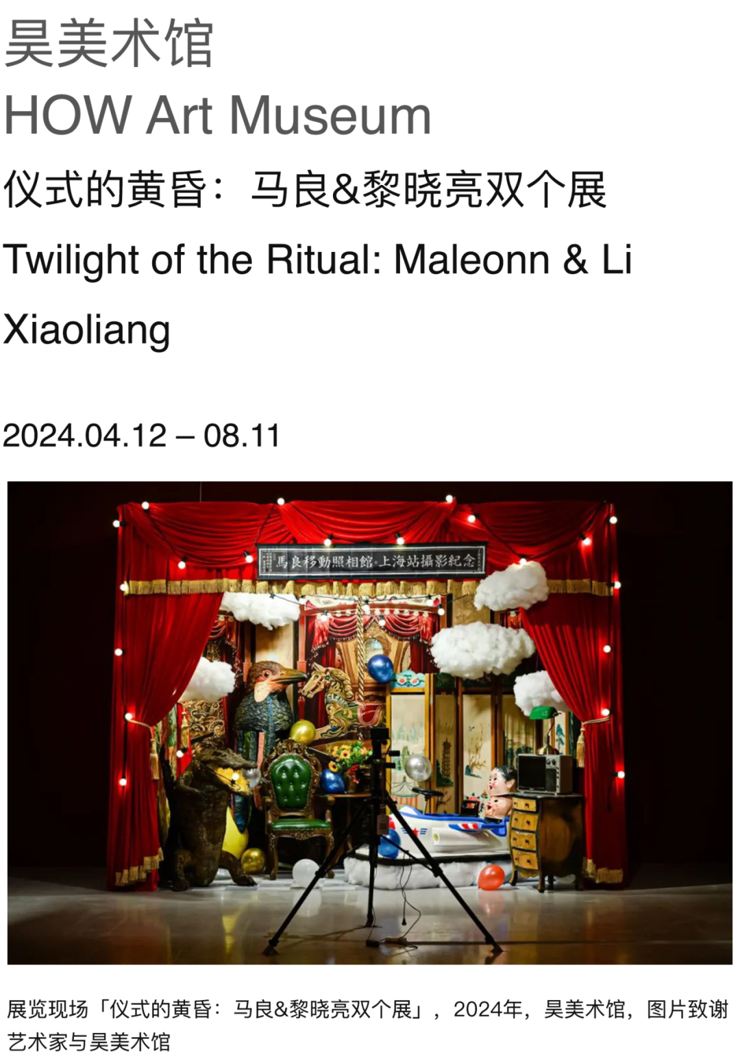 昊美术馆正在呈现马良与黎晓亮的合作展览“仪式的黄昏”。展览将以两个独立的个展分别呈现“马良:恋恋风尘”和“黎晓亮:游猎的光”。本次展览由鲁明军担任策展人。