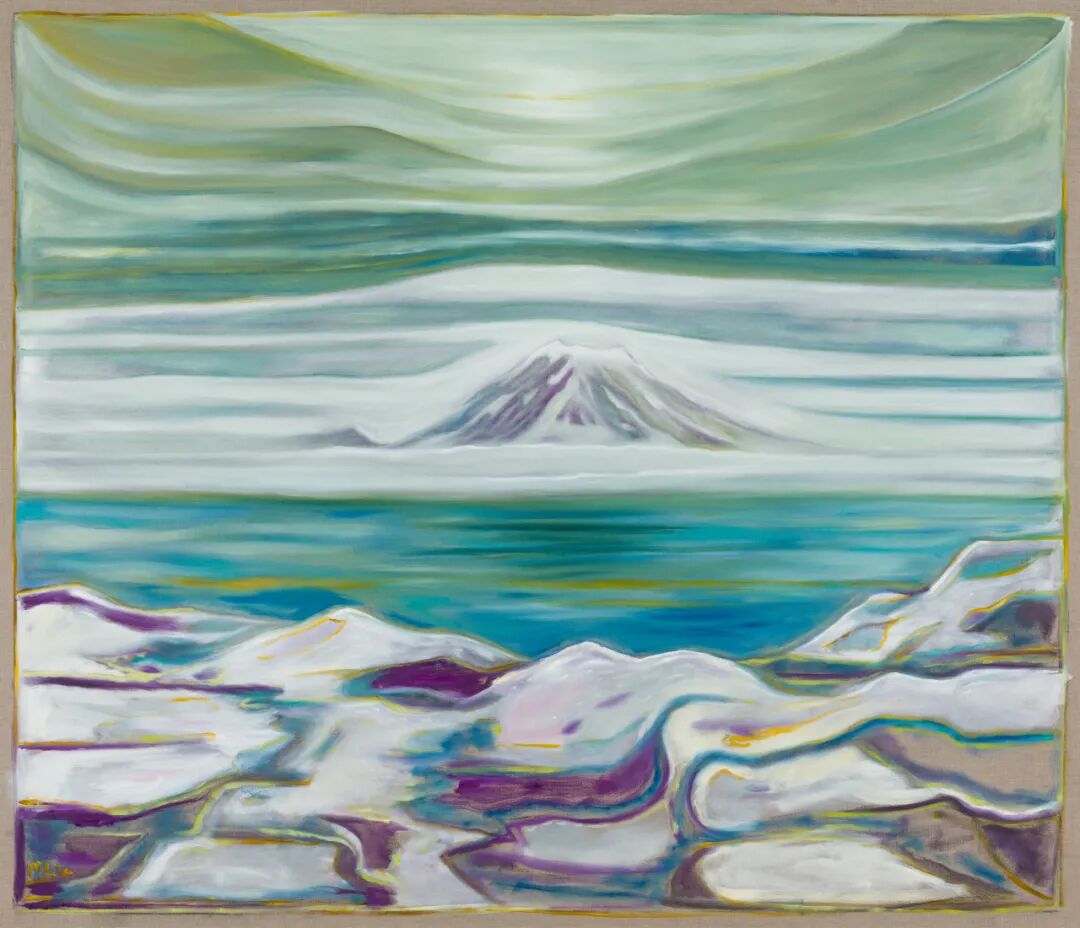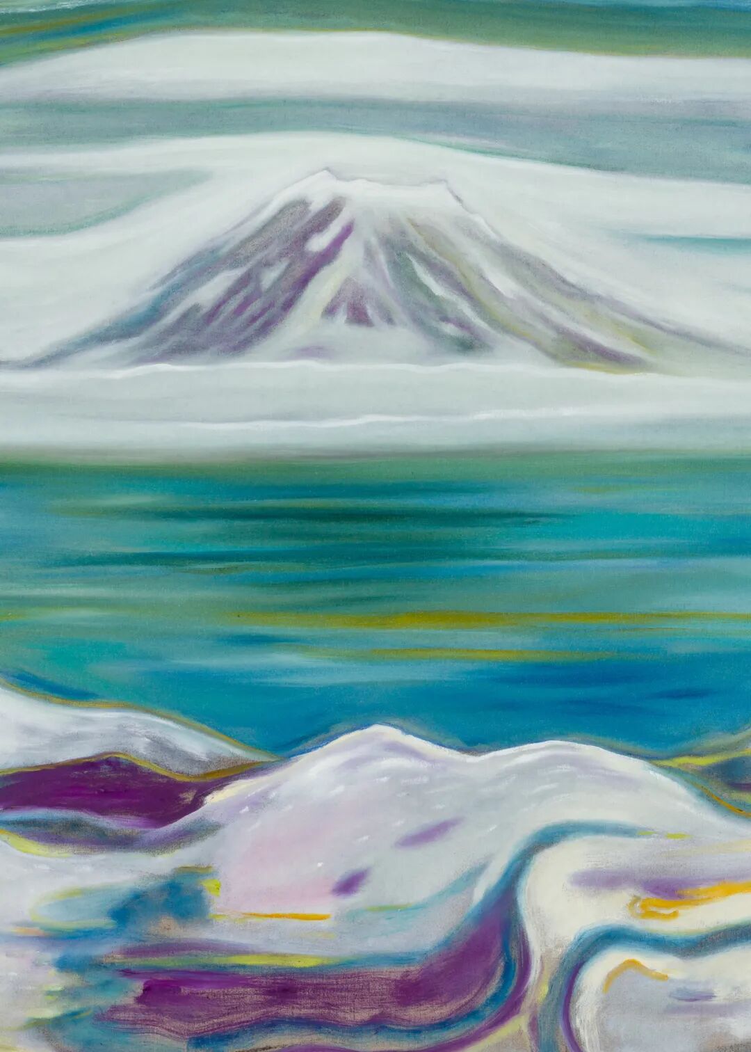在作品《隔水相望》(seen across water)中,一座山似乎从海中缓缓升起,与头顶的天空融为一体,近乎消融。