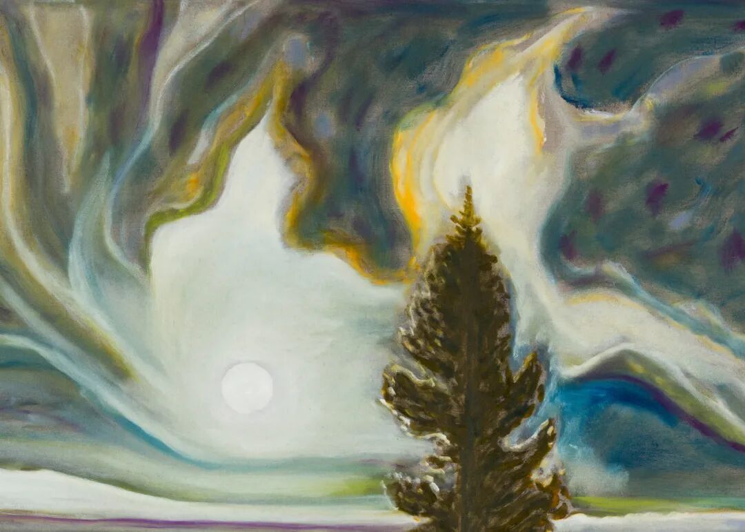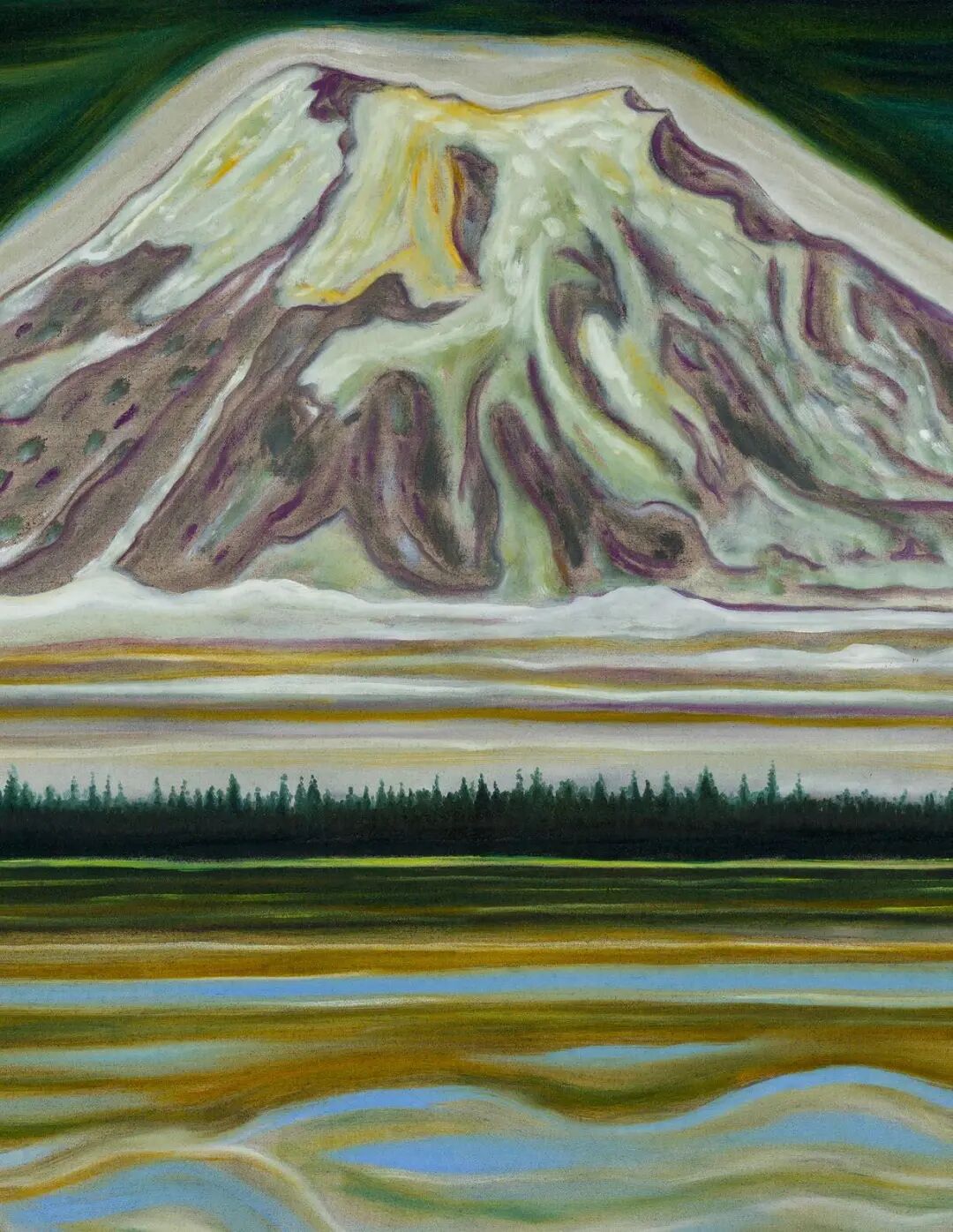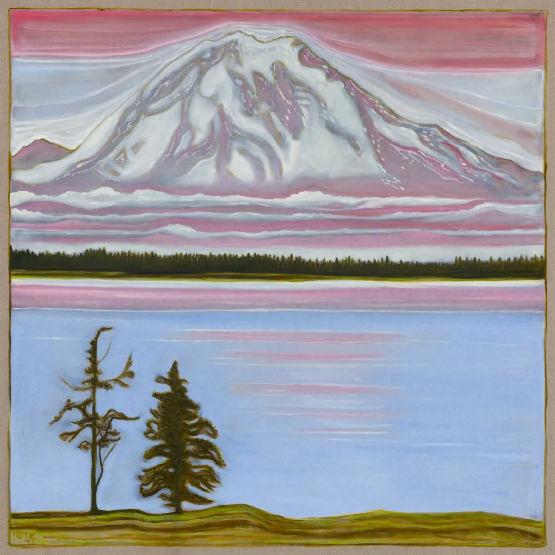 在《夜晚的塔霍马山》(tahoma at nite)中,查尔迪斯的构图将画面均匀切分,高耸的山峰倒映于几乎静止的水面上,一排树木形成了一条稠密的细线,分隔着天地之间。