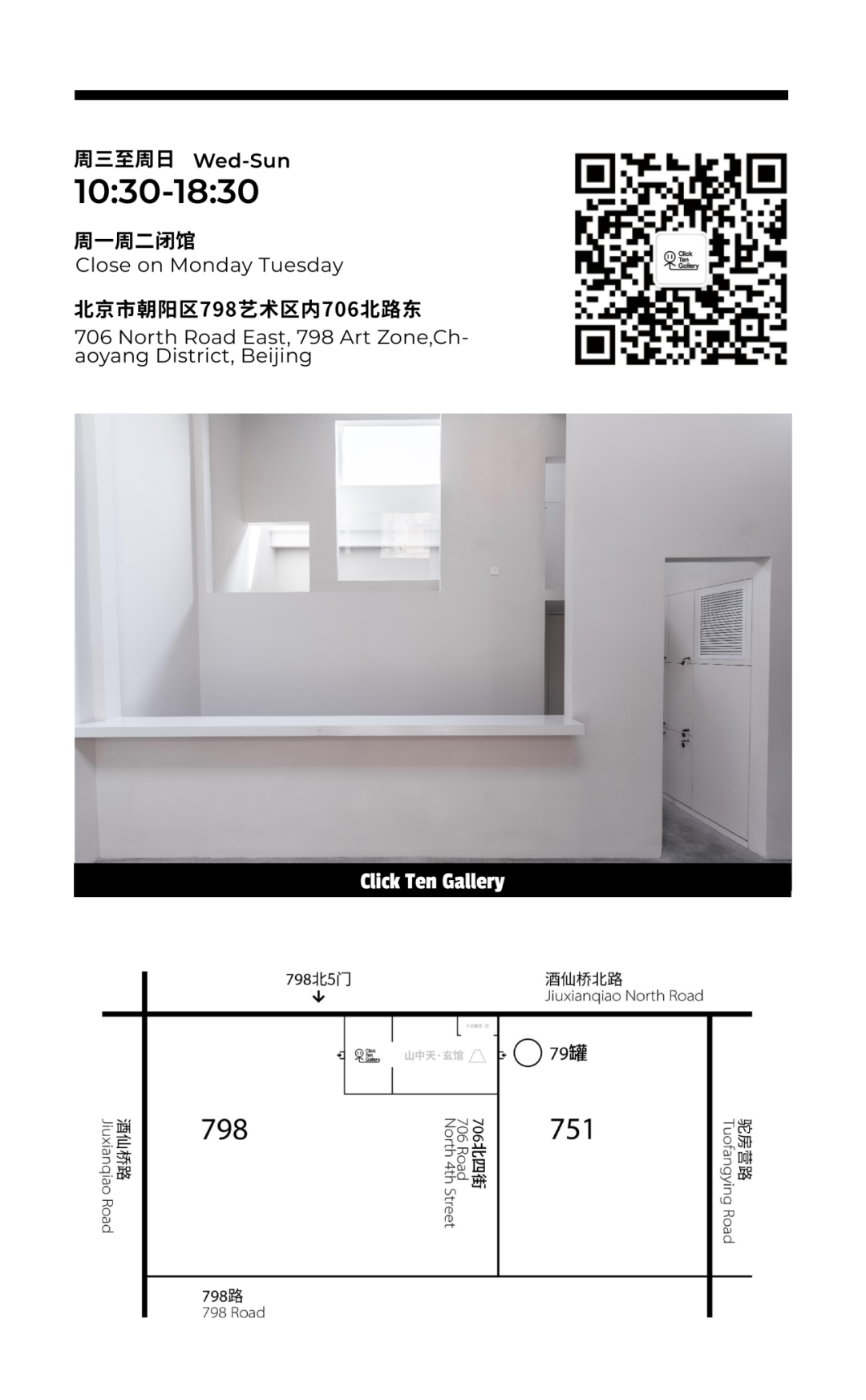 Founded in 2020 in the 798 Art District, Beijing, Click Ten Gallery is a commercial gallery and art foundation. We focus on discovering a new generation of Chinese artists with a global vision and introducing outstanding international artists to China. We also hope to closely connect with artists, curators, scholars, and collectors, building a working system through a physical space and a professional team to explore the diverse future of contemporary Chinese art.