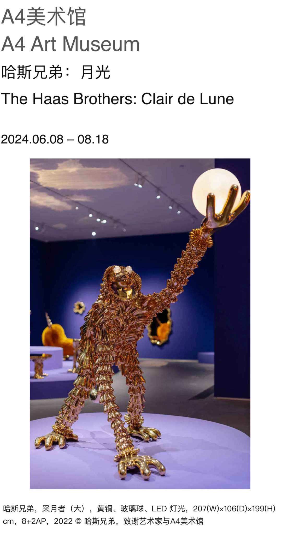 A4美术馆举办哈斯兄弟的中国首次美术馆个展首展“月光(Clair de Lune)”,展示他们的四个系列“龙虾医生佐伊伯格”(Zoidberg)、“挂毯”(Tapestry)、“滴落的幽灵”(Drippy Ghosts)、“怪兽”(Beast),共36件包含雕塑、镜子、挂毯在内使用丰富的材料和创作手法的作品,将观众们带入一个如梦似幻、温暖童真的世界,用温柔的月光治愈内心的伤痕。