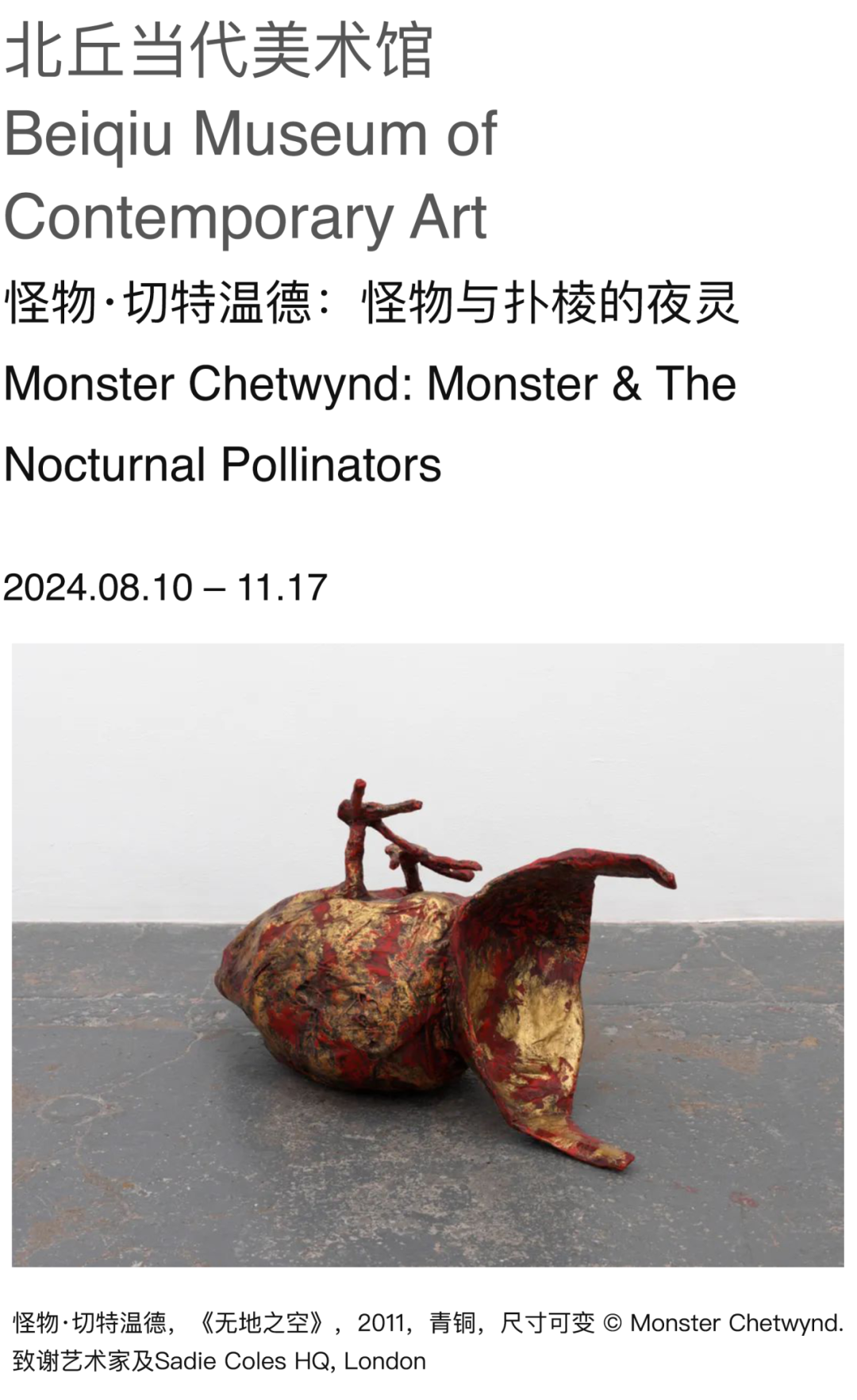 北丘当代美术馆宣布将于2024年8月10日起举办英国著名艺术家怪物·切特温德(Monster Chetwynd)个展“怪物与扑棱的夜灵”。作为怪物·切特温德(Monster Chetwynd)在亚洲地区的首次大型机构个展,本次展览将展出艺术家近20年极具代表性的18组创作。展览将系统性地介绍怪物·切特温德(Monster Chetwynd)在绘画、雕塑、装置、录像等领域的创作实践,还将展出艺术家近年来的全新创作。