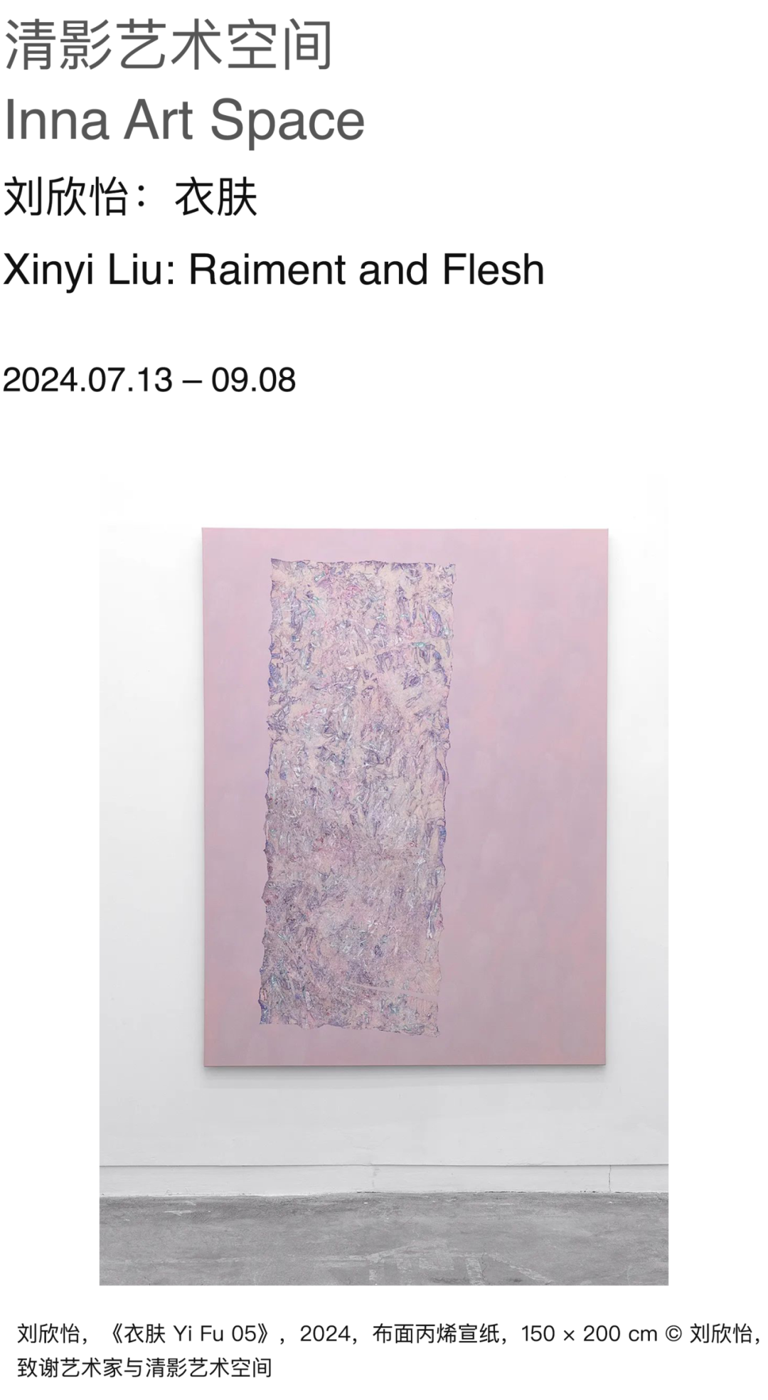 清影艺术空间呈现艺术家刘欣怡在国内的首次个展 “衣肤”。刘欣怡于6月10日在清影10号空间进行了为期一个月的驻留创作,基于她近年来从触觉出发的探索,她在驻留期间开启的一系列新作集中体现了肌体的裂痕与还原以及对风雨、湿度等感受的转化。