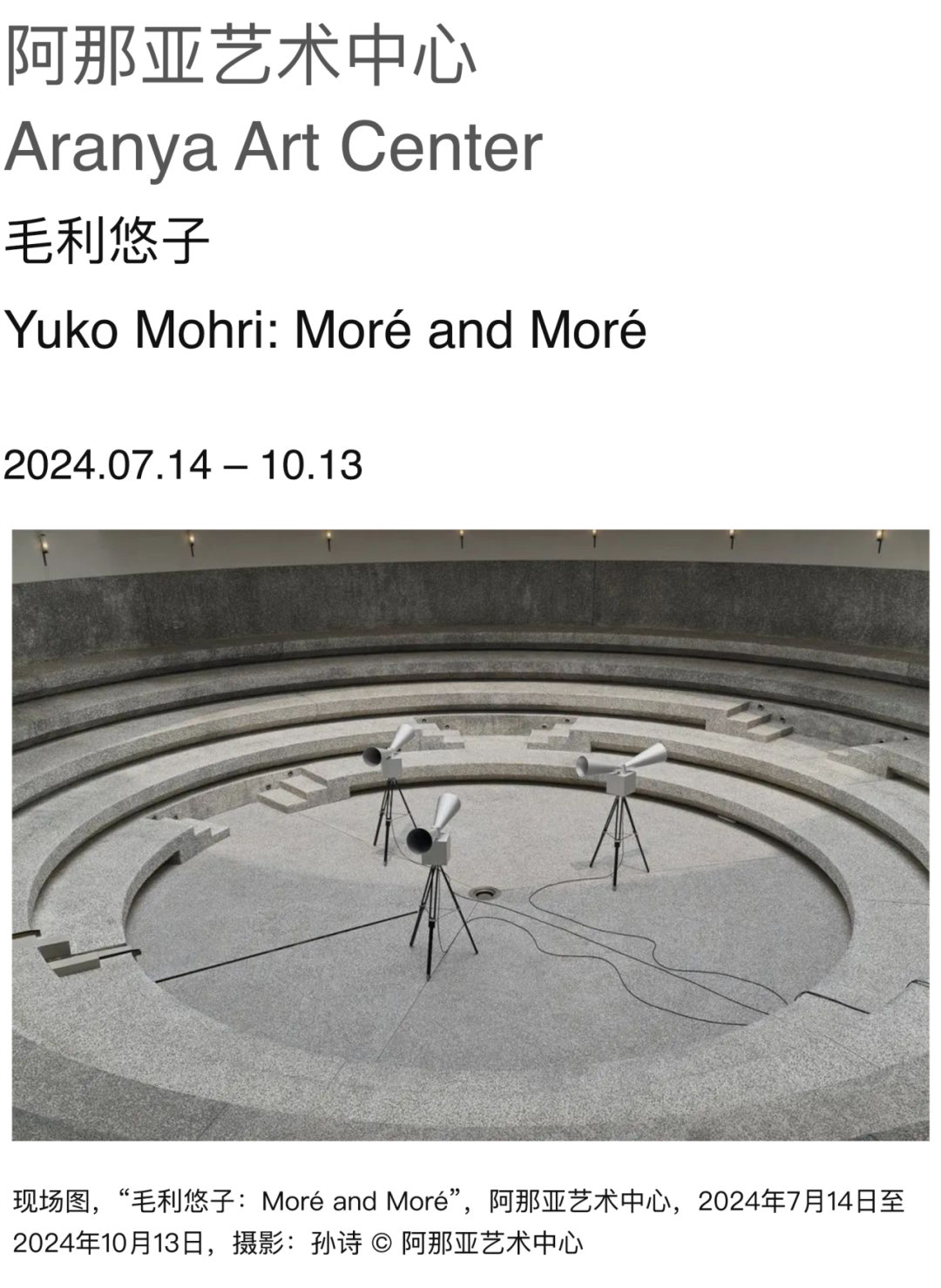 阿那亚艺术中心荣幸呈现日本艺术家毛利悠子(Yuko Mohri)在中国的首场美术馆个展,展出一系列摄影作品和两件全新委任的室内装置及户外声音雕塑。毛利悠子通过对物品的重新组合讲述了本土和外来物之间的流转轶事。她对日常物的挪用告诉我们,尽管大规模工业制具业已泛滥,我们依然可以做出对于如何和为何使用这些物品的自主选择。