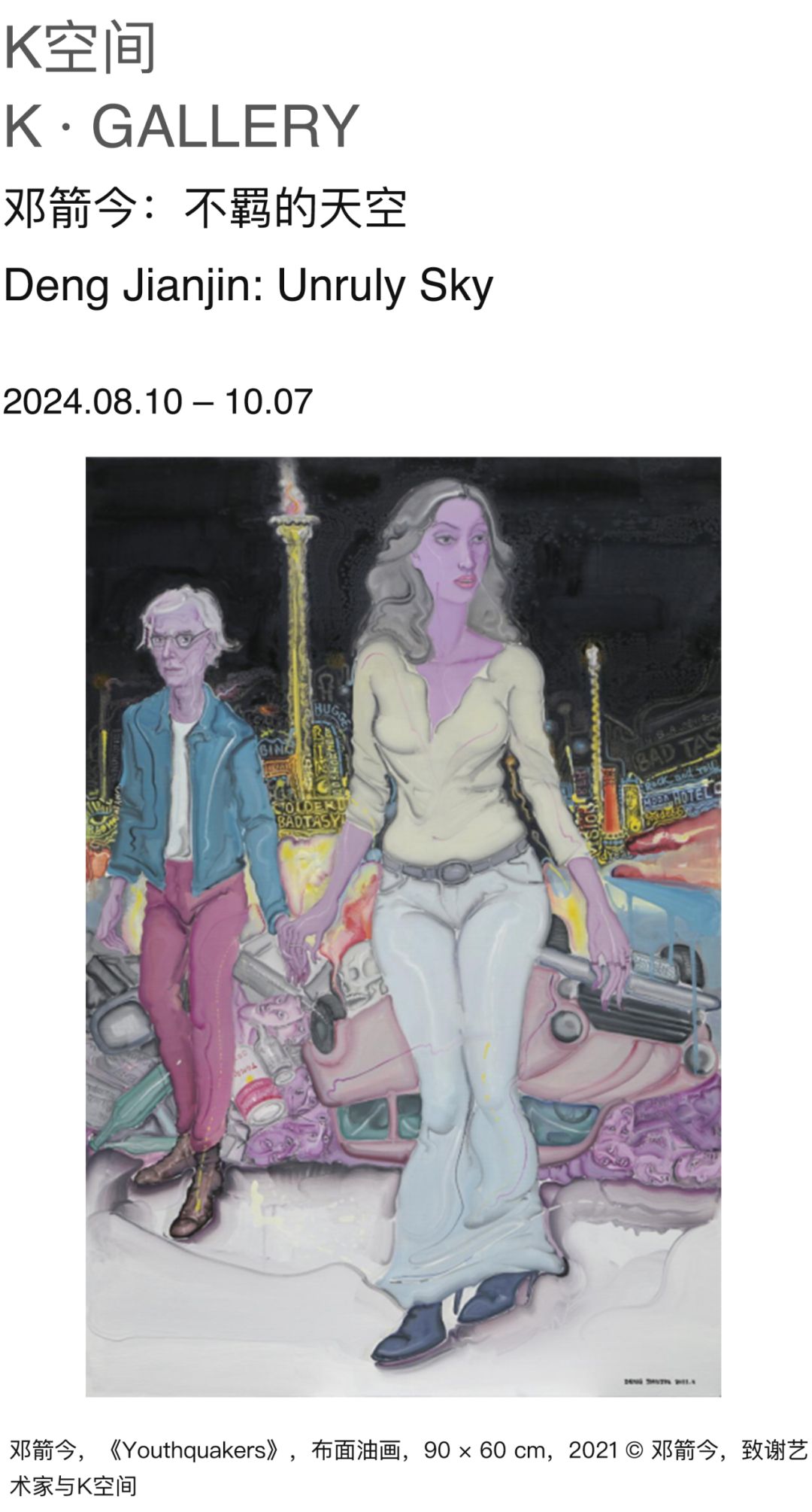 “在邓箭今的艺术想象语言中,性别的角色或性别之间的紧张关系在表现中尤为重要。事件中的固定角色通常是可识别的。所描绘的世界让观众可以照见自己永远不敢面对的东西。邓箭今大胆地突出了激烈的冲突,并将效果与柔和的色彩混淆,要么拉开距离,要么部分强调叙事。”