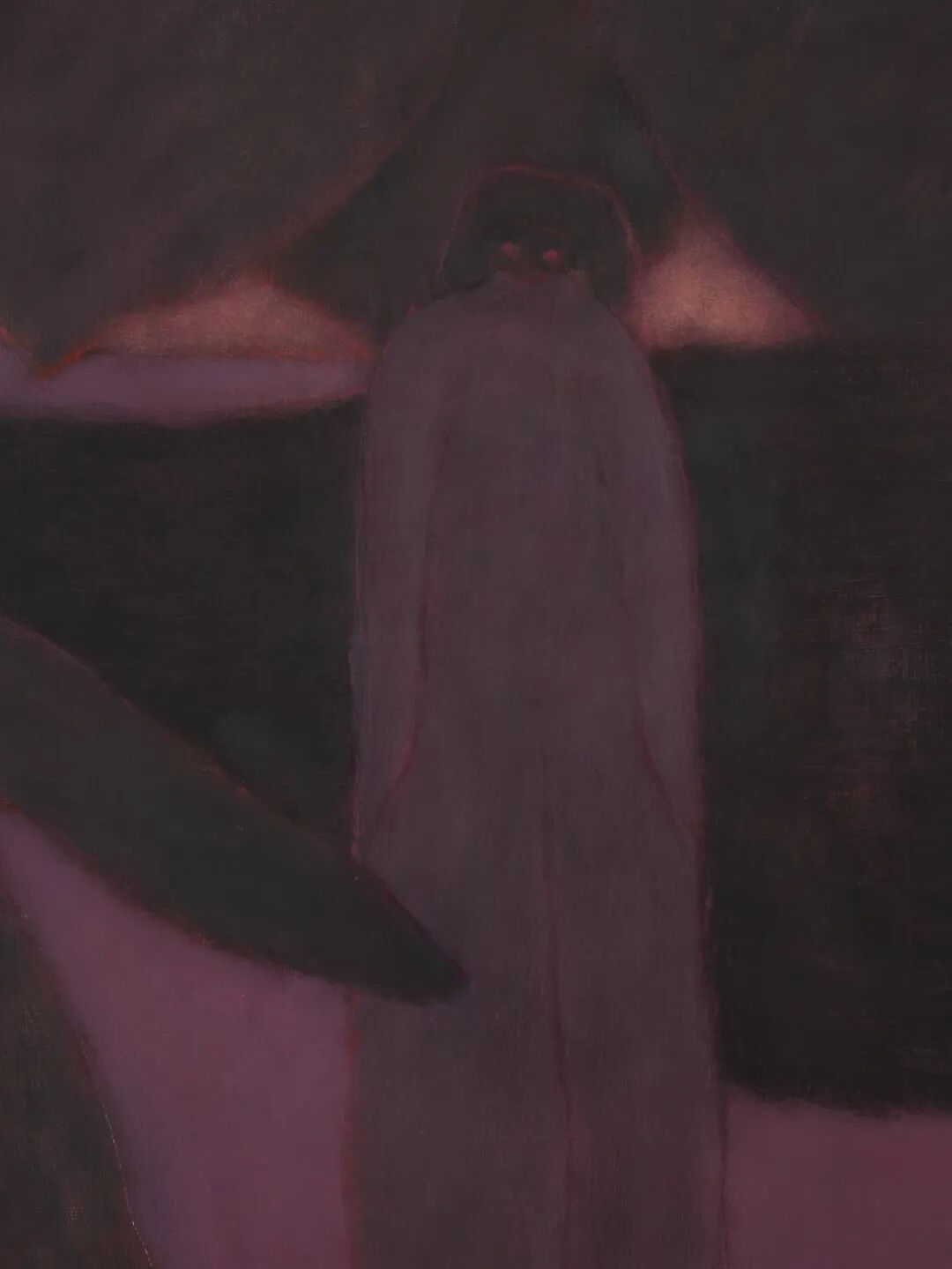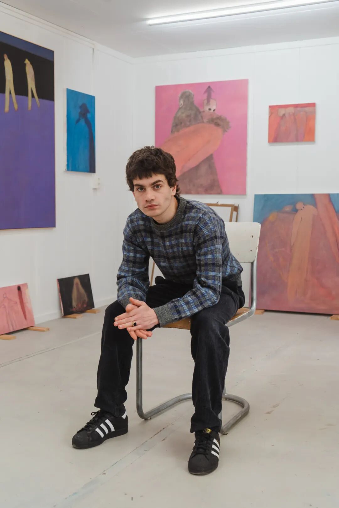 Eli de Haas(生于1999年,荷兰鹿特丹)在他色彩丰富、含义模糊、充满魔力的作品中探索隐蔽世界的边缘。他的作品唤起观者孩童般的精神,引发直觉的感受和反应,而非理性的结论。作品仿佛梦境或童话的片段,经常呈现自由、随意、有时略显天真的人物形象,为他所描绘的现实呈现一种更直观、更具体的存在,而不会将单一、固定的解释固定下来。在de Haas的作品中,身体会变成风景,剪影会从阴影中出现,而面孔则会成为观者内心世界的投影。