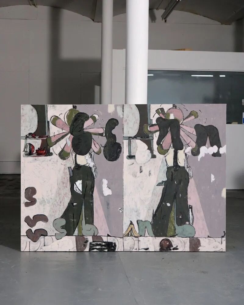 F:我们像在纸本上一样在大张的画布上创作。布面的正反两面会被我们所使用到,翻转、剪裁、旋转再缝合。在整个创作过程中,我们不会小心翼翼地将作品视若珍宝,它们只是大型的涂画。许多作品背面带有未完成的作品,展示着那些未能最终成形的痕迹。