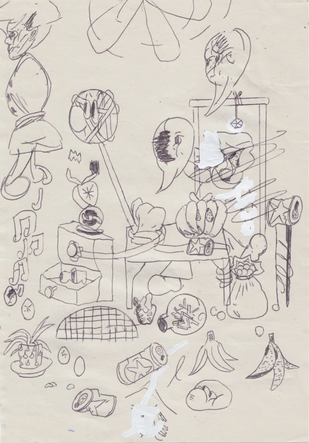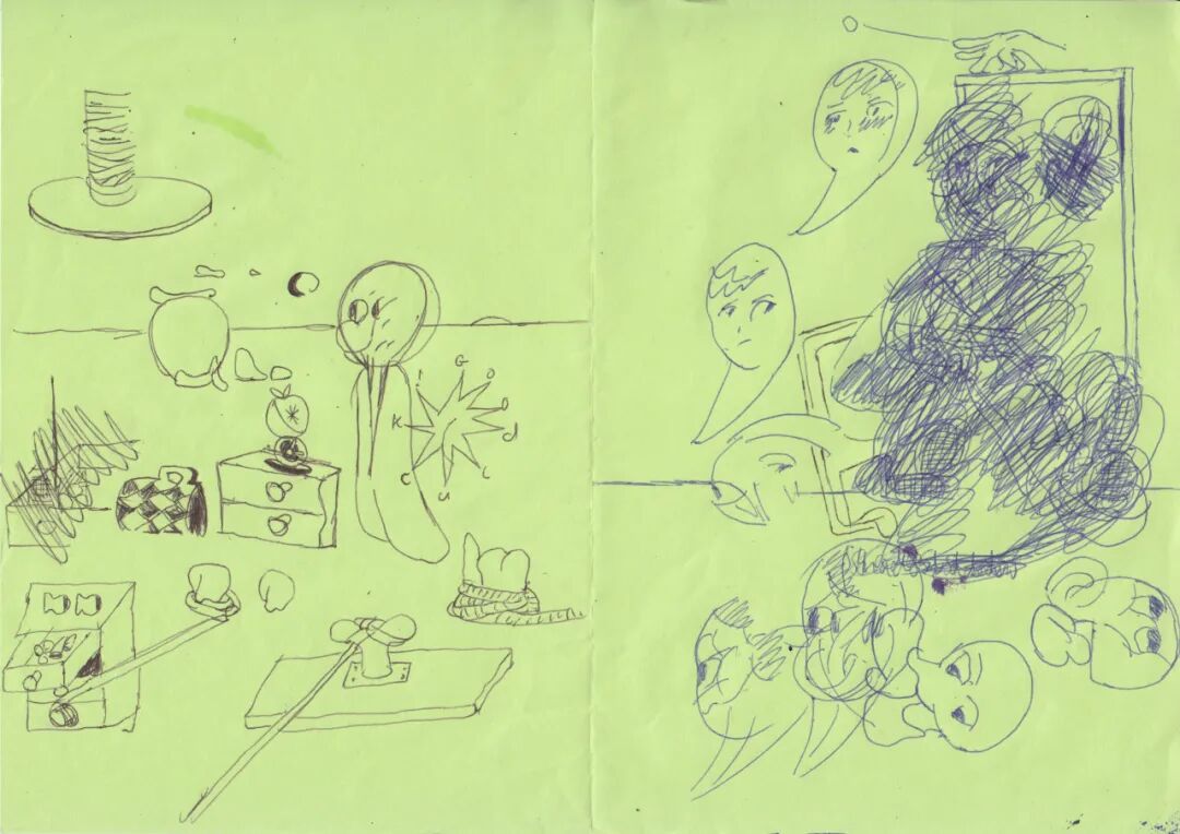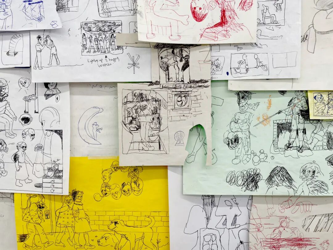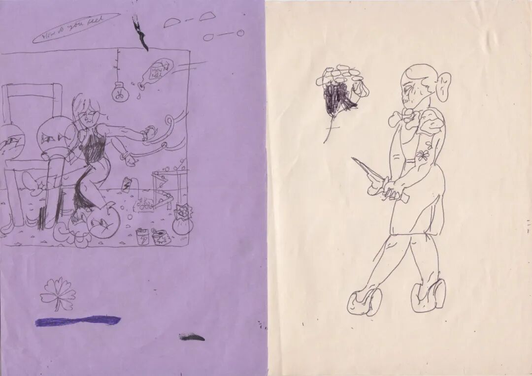 F:我们的纸本作品常常散落在工作室的地面,被不经意的踩踏,上面也许还会有购物清单、撕痕和笔记,有时会还会像卫生纸一样被揉成一团随手塞进口袋里。它们带着强烈的物理属性,像是垃圾或废弃物,却是故事中定格的瞬间,短暂而珍贵。犹如打开一本速写本,没有精心的渲染和过多的思考,却是如此的鲜活。我一直很喜欢翻看艺术家的速写本、他人的手机涂鸦、日记草图或者未完成的创作,我认为这些比最终完成的作品所承载的更多,因为它们是开放的。这也是我们在绘画中一直思考的问题—— 对我们来说,重要的是每一件作品都能拥有自身的能量和个性,有自身的情绪,保持开放。