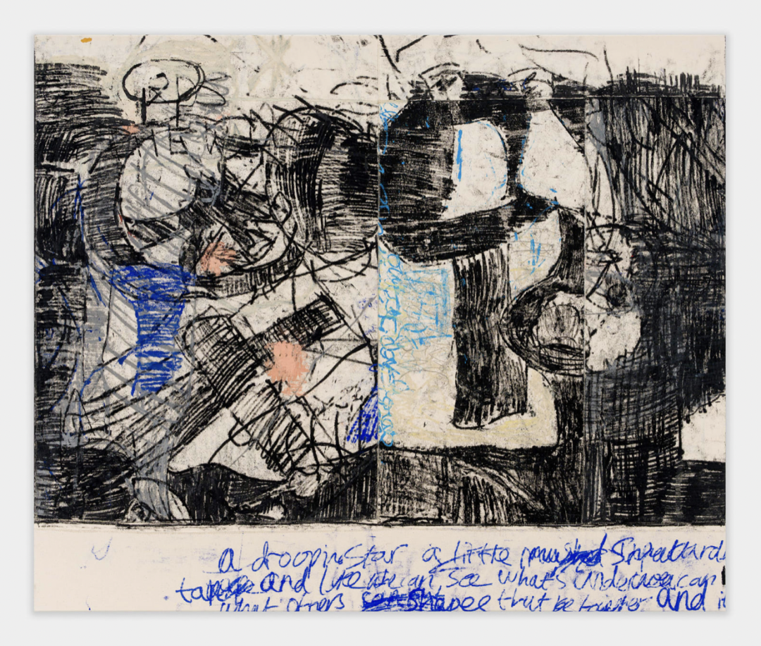 F:我有时候会翻阅这个本子,加入一些新的内容,或从中抽取某些信息,又或是将文字与其他内容相混合,像是在创作绘画一样。某些东西会在此以新的形态出现,我们可以将它带入绘画之中,让它变得更有意义。一切总是自然而然地发生,事物总会找到其所在的位置。文字在我们的创作中一直占据着重要位置,有时文字游戏也会引发灵感风暴,并在作品中有所体现。