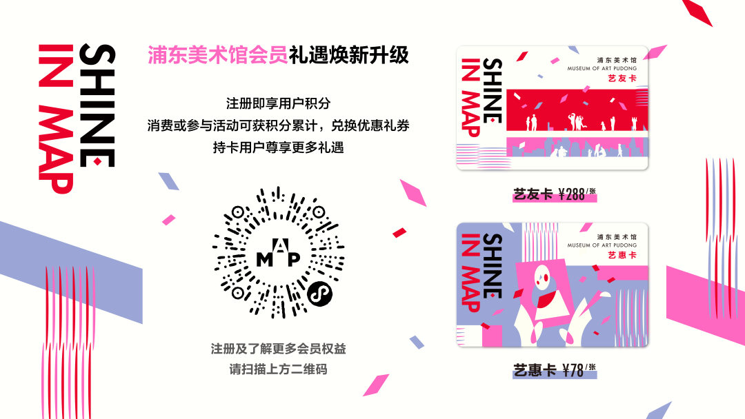 浦东美术馆会员卡,更是一种艺术的选择、艺术体验的分享。未激活的电子卡与实体卡均可转赠,无论是送给亲朋好友和商务伙伴,亦或是自己珍藏,都是绝佳之选。邀您与艺术之友一起成为MAP会员,尽享令人心动的丰富权益。